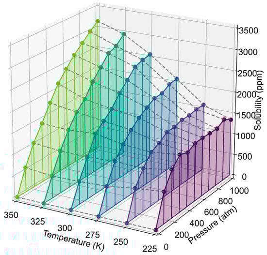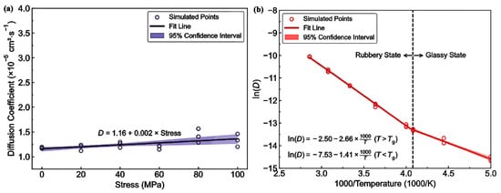 - The solubility coefficients of H2 in PA6, with 30.00% crystallinity, exhibit Henry-type behavior that is distinct from gases with higher solubilities, such as CO2 [33]. Temperature negatively affects the solubility coefficient of H2 in PA6; as temperature increases, the thermal motion of the gas and polymer molecules rises, making gas adsorption more difficult. Consequently, this leads to a gradual increase in the impact of temperature on the solubility coefficient, resulting in a slower rate of change, as illustrated in Figure 10a.