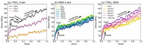 - Tensile properties: The findings from Figure 15 illustrate the complex interplay of temperature, hydrogen content, and pressure on the stress–strain behavior of PE. Figure 15a indicates that as the temperature increases from 250 to 350 K, the stress–strain curve transitions from a more pronounced elastic behavior to a bilinear response, indicating reduced stiffness and strength owing to weakened intermolecular interactions and enhanced chain mobility at elevated temperatures. Figure 15b shows the effects of increasing hydrogen content, where a higher number of H2 molecules correlates with decreased slopes in the elastic region, signifying a reduction in the elastic modulus and yield strength owing to the plasticizing effects of hydrogen that promote chain mobility and reduce intermolecular cohesion. Furthermore, Figure 15c emphasizes that increasing the pressure leads to significant enhancements in the elastic modulus and yield strength, as the tighter packing of the polymer chains and improved intermolecular interactions under high pressure counter the weakening effects of hydrogen. The results presented in Figure 16 further quantify these observations, revealing that the elastic modulus and yield strength of PE decrease linearly with the addition of H2 molecules while increasing markedly with pressure. This indicates a nuanced relationship in which the detrimental effects of hydrogen can be mitigated by the application of pressure, thereby improving the mechanical properties of PE in hydrogen-rich environments.