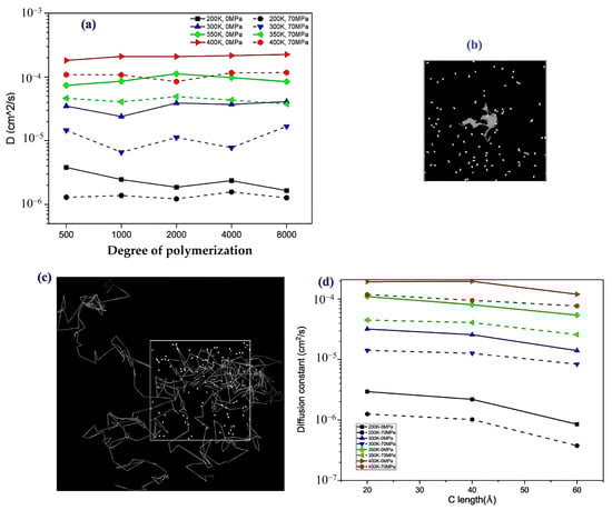 - Influence of polymer structure on the D: Examining degree of polymerization, side chains, and orientation: The diffusion constant of hydrogen in PE does not show a significant correlation with the degree of polymerization (DP), particularly when the chain length is long, which results in fewer end groups that affect the diffusion rates (Figure 17a). Prior studies have suggested a negative correlation between the diffusion rate and DP, but this research infers that beyond a certain DP, other factors such as the molecular structure and processing conditions (including crystallinity and orientation) play more critical roles. Additionally, the diffusion pathways of H2 molecules at different temperatures (200 and 400 K) revealed that at lower temperatures, H2 molecules exhibit limited movement mainly within stable free volume regions (Figure 17b), whereas at higher temperatures, their trajectories become more dispersed and irregular, suggesting that a free volume redistribution occurs as the polymer transitions to a rubbery state, which may deviate from the relationship between the diffusion constant and the mean squared displacement established from the Einstein relation (Figure 17c). Figure 17d illustrates the correlation between the orientation of PE chains and the hydrogen diffusion constant. Increased chain orientation led to a reduction in the diffusion constant for hydrogen within the polymer matrix. This phenomenon can be attributed to the denser and more compact structure created by the oriented chains, which restricts the movement of H2 molecules compared to a system lacking such orientation. As a result, the compact arrangement of the oriented chains presents a barrier that impedes the free diffusion of hydrogen.