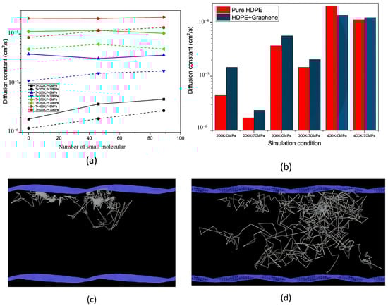 - Influence of additives and reinforcements on hydrogen diffusion in PE: The inclusion of small molecules, specifically C20H42, significantly enhances the H2 diffusion constant in PE systems at various temperatures and pressures (Figure 18a), demonstrating a plasticizing effect that increases chain mobility by creating additional free volume. This trend aligns with previous research conducted on nylon 11 [2]. However, the relationship between diffusion and small molecules becomes less clear in systems operating above Tg, where other factors may also influence the diffusion process. Figure 18b presents a comparison of the hydrogen diffusion constants between the PE system and graphene/PE composite systems, along with the trajectories of the 10 H2 molecules. The presence of the graphene layer leads to an increase in the hydrogen diffusion constant at lower temperatures, whereas at higher temperatures, it decreases. These findings indicate that the diffusion of H2 molecules is enhanced at the interface between graphene and PE, which is attributed to the weak van der Waals interactions between the two materials (Figure 18c). However, the presence of graphene can decrease the diffusion constant, especially at higher temperatures (400 K) (Figure 18d), because it may obstruct H2 molecules and constrain the mobility of nearby polymer chains. Additionally, the redistribution of free volume around graphene is likely limited. The simulations were conducted without a pressure drop; however, H2 is anticipated to diffuse in the direction of the pressure drop, suggesting that to optimize the effectiveness of graphene as a filler, it should be aligned opposite to the pressure drop direction.