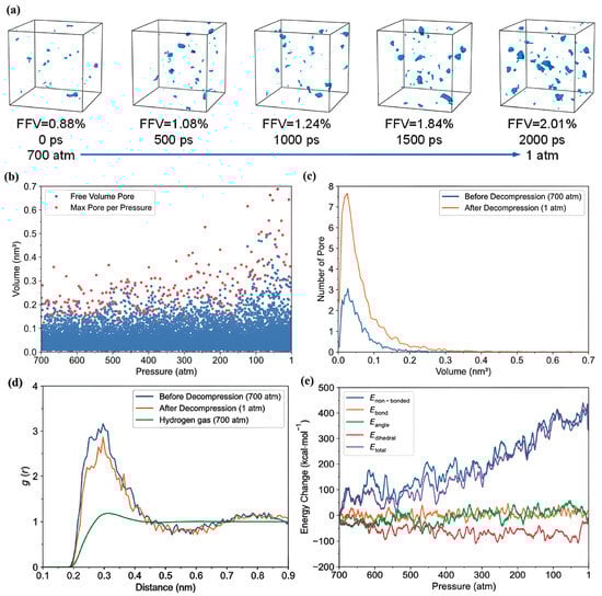 - Energy changes during decompression: Figure 22a depicts the changes in the free volume within PE systems containing 155 H2 molecules following decompression from 700 to 1 atm at 300 K. Data were collected at intervals of 0, 500, 1000, 1500, and 2000 ps. During this process, the FFV rose from 0.88% to 2.01%, accompanied by an increase in the number of cavities from 42 to 80, and the average pore size growing from 0.06 to 0.07 nm3 at the end of decompression. Figure 22b shows a scatter plot illustrating that as the pressure decreased, the maximum pore size increased, with the majority of pore sizes remaining under 0.2 nm3. Additionally, Figure 22c shows a significant increase in the quantity and dimensions of the pores following decompression. In Figure 22d, the RDF reveals that the peak at approximately 0.3 nm for hydrogen clustering remains significant, and the peak height post-decompression is slightly reduced, suggesting an increased dispersion of H2 molecules within the PE matrix. The analysis of internal energy shows that energy changes during decompression are predominantly influenced by non-bonded interactions among the polymer chains, particularly as the intermolecular distances increase (Figure 22e). This expansion in intermolecular spacing weakens the cohesive forces within the polymer matrix, establishing favorable conditions for the generation of free volume and consequently, increasing the risk of cavitation damage.
