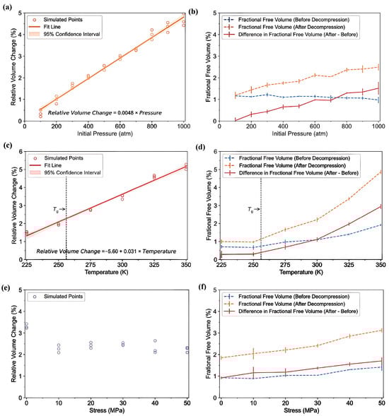 - Factors increasing cavitation risk: Figure 23 highlights the significant effects of the initial pressure, temperature, and tensile stress on the behavior of a PE system during decompression. As shown in Figure 23a, the relative volume change exhibits a linear increase with higher initial pressures, increasing from 0.48% at 100 atm to 4.80% at 1000 atm. In Figure 23b, the FFV exhibits a slight decline before decompression owing to mechanical compression but shows an increase post-decompression, suggesting an elevated risk of cavitation. Furthermore, Figure 23c and d indicate that at an initial pressure of 700 atm, the relative volume changes and FFV increased significantly with increasing temperature. This underscores the fact that temperatures exceeding the Tg result in a notable expansion of the free volume, thereby increasing the likelihood of cavitation. Finally, Figure 23e,f demonstrates that although the relative volume changes during decompression remained relatively stable across different levels of tensile stress, the FFV significantly increased with higher applied stress. This indicates that tensile tension promotes the expansion of the free volume, consequently increasing the risk of cavitation within the PE material. The influences of the initial pressure, hydrogen content, temperature, and applied tensile stress notably enhanced the increase in free volume during decompression, further increasing the risk of cavitation.