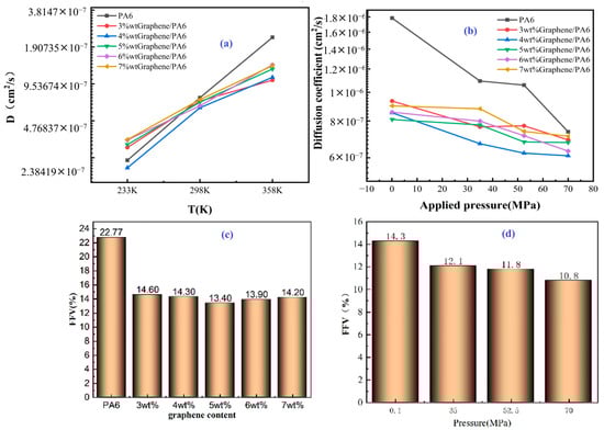 - The diffusion coefficients of six systems at different temperatures (233 K, 298 K, and 358 K) show an increase with temperature, as illustrated in Figure 24a. At 358 K and 70 MPa, pure PA6 has the highest diffusion coefficient of 2.28 × 10−6 cm2/s, attributed to enhanced molecular mobility with rising kinetic energy [26]. A prior study by Dong et al. [26] reported a similar coefficient of 2.36 × 10−6 cm2/s for PA6 at 358 K and 87.5 MPa, with a 10.6% error margin deemed acceptable for gas diffusion measurements. The diffusion coefficients for graphene/PA6 composites also increase with temperature; for instance, the 3 wt% composite at 358 K shows a 48% increase compared to 298 K. Higher graphene concentrations (4 wt% to 7 wt%) lead to increases in diffusion coefficients by approximately 77%, 138%, 115%, and 89%, highlighting the considerable effect of temperature on diffusion properties, aligning with earlier findings [53].