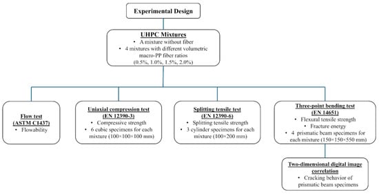 The design of the experimental study, including mixture design variables, specimen details, testing procedures and investigation parameters, is illustrated in Figure 1.