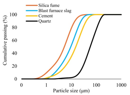 The mixture design for the UHPC utilized in this study was based on the methodology established by Hasgul et al. [61] and Turker et al. [62]. The base mixture included CEM I 42.5 Portland cement (Bursa Çimento, Bursa, Türkiye), silica fume (Finnfjord AS, Finnfjord, Norway), blast furnace slag (Oyak Bolu Çimento/Ankara, Türkiye), quartz sand (Aydınlar Madencilik/Izmir, Türkiye). The particle size distribution of the materials is shown in Figure 2 [63]. A high-range water-reducing admixture (ViscoCrete® ACE 450) was included in mixtures to achieve proper workability without experiencing bleeding and segregation. The water-to-binder ratio was kept constant at 0.17 by weight. The maximum particle size of the quartz sand was 0.225 mm. The macro-polypropylene (PP) fibers (KORDSA/Istanbul, Türkiye) were considered in monofilament form, with a length of 48 mm and a thickness of 0.72 mm were considered (Figure 3). The polypropylene fibers have a tensile strength of 550 MPa and an elastic modulus of 8.5 GPa. The materials and proportions of the UHPC mixtures are given in Table 1 [63]. The NF indicated the reference UHPC mixture without fibers, whereas the letter F was used for UHPC mixtures with fibers. Four different volumetric ratios were considered for the UHPC mixtures with macro-PP fibers. The fiber content by volume is indicated with a number in the case of the letter. For example, F0.5 represents a UHPC mixture containing 0.5% macro-PP fiber by volume (Table 1).