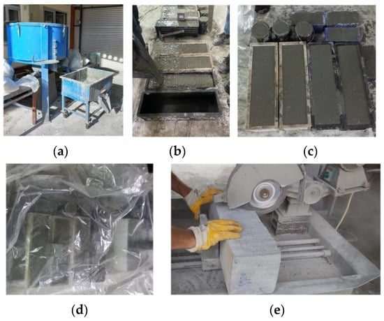 Preparation of test specimens: (a) concrete mixing setup; (b) casting; (c) specimens after casting; (d) curing; (e) notch sawing.