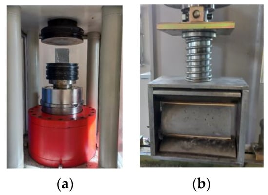 The compressive strength of the mixtures was determined by the uniaxial compression tests of cubic specimens according to EN 12390-3 [67]. The tests were carried out under load control using a servo-hydraulic compression testing machine with a load capacity of 2500 kN (Dotek/Türkiye) (Figure 6a). The splitting tensile strength of the mixtures was determined by splitting tensile tests on cylinder specimens according to EN 12390-6 [68]. Cylinder test specimens were placed horizontally on the loading frame and loaded linearly in the perpendicular direction to the cross-section plane (Figure 6b). The constant loading rate was applied as 1256 N/sec [68].