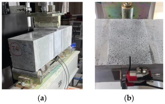 To evaluate the effectiveness of macro-PP fibers on the flexural behavior of UHPC, three-point bending tests were performed on notched beam specimens according to EN 14651 [65]. The tests were carried out at a displacement rate of 0.2 mm/min using an actuator controlled by a servo hydraulic control unit with capacity of a 500 kN (Utest/Türkiye) (Figure 7a). The beams were simply supported with a clear span of 500 mm and the load was applied at the center of the span. Two 5 mm capacity linear transducers were placed horizontally on the bottom of the beam to determine the crack mouth opening displacement (CMOD) values which express the opening at the end of the notch located in the center of the span. An L-shaped steel plate was placed at the end of the transducers (Figure 7b) [63].