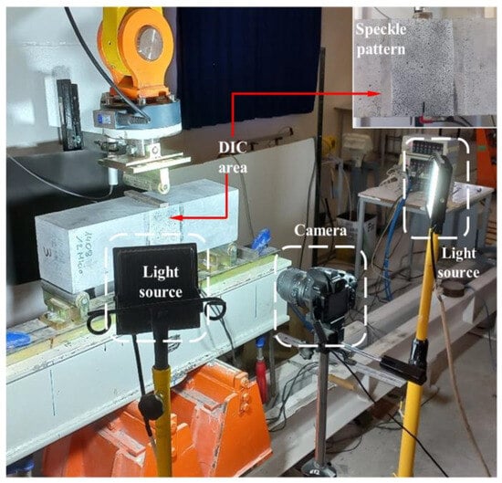 To investigate the effects of different macro-PP fiber ratios on the formation and development of cracks, the strain profile on the surface of the beams was monitored by the two-dimensional digital image correlation (2D-DIC) method. Since the crack will start at the notch, an area of 100 × 150 mm in the midspan of the beam covering the notch was chosen for 2D-DIC analysis. To conduct the 2D-DIC, it is necessary to apply a randomly distributed speckle pattern on the surface with high contrast. For this, the target area was sprayed with matte white paint. After the surface completely dried, the area was randomly spotted with matte black paint. A high-resolution camera, fixed on a tripod 50 cm away from the test specimen, was used to capture the images of the target area (Figure 8) [63]. To eliminate the differences between the images caused by variations in natural light, the target area was covered by two LED spotlights placed at an angle of 45° (Figure 8). During the tests, images with a resolution of 3008 × 2000 pixels were captured every 10 s. The 2D-DIC analyses of the images were performed with the GOM Correlate software [69] using the default correlation method. The subset size was selected as 19 × 19 pixels and the step size as 16 pixels.