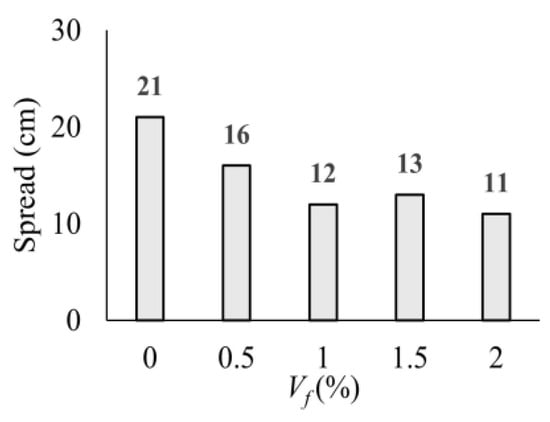 The measured spread values for the UHPC mixtures with different volumetric fiber ratios (Vf) are presented in Figure 9. The highest spreading value was obtained in the mixture NF as expected. It is clearly seen that the fluidity of UHPC decreases with increasing macro-PP fiber content. The spread value exhibited a notable decline compared to the NF mixture, reaching 24%, 43%, 38%, and 48% reductions for mixtures F0.5, F1.0, F1.5, and F2.0, respectively (Figure 9). It should be noted that the amount of high-range water-reducer additive was kept constant to investigate the effect of fiber ratio. The admixture content was slightly increased for the mixtures of 1.5% and 2.0% fiber by volume to prevent excessive agglomeration of fibers. However, at fiber contents above 0.5%, fluidity decreased significantly while spread values remained similar.