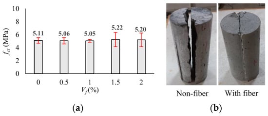 (a) Variation in splitting tensile strength with volumetric fiber ratio; (b) influence of macro-PP fiber on the fracture mode of cylinder specimens.