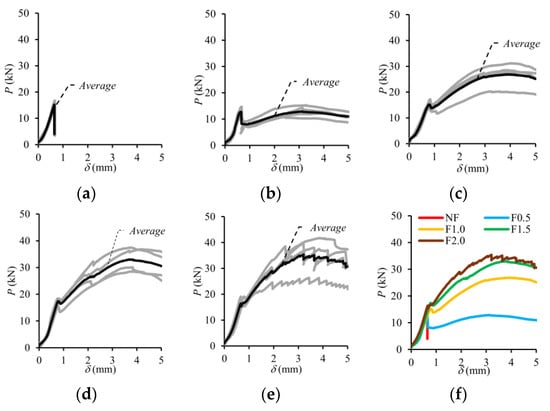 Experimental P-δ curves of the test beams: (a) Vf = 0%; (b) Vf = 0.5%; (c) Vf = 1.0%; (d) Vf = 1.5%; (e) Vf = 2.0%; (f) average.