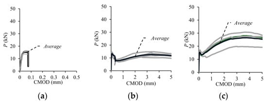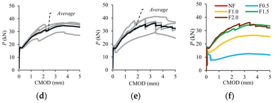 The experimental load–crack mouth opening displacement (P-CMOD) responses of the four notched beams for each volumetric fiber ratio (Vf) are presented in Figure 14, while the average curve is shown by bold lines. The average P-CMOD responses for each Vf are also presented in Figure 14f. As seen in Figure 14, the load increased approximately linear with the increase in CMOD until cracking. When the cracking occurred, the elastic deformation phase ended. In the beams without fibers, deformation capacity was reached with the crack initiation (Figure 14a). On the other hand, the behavior of the beams with macro-PP fibers continued despite a sudden load drop depending on fiber ratio (Figure 14b–e).