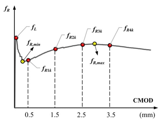 The residual flexural tensile strengths (fR) obtained by using Equation (3) for certain values of CMOD to determine the characteristics of the post-cracking behavior according to EN 14651 [65]. In Equation (3), P is the load, l is the length between supports, b is the width of the beam cross-section, and hsp is the distance between the tip of the notch and the top of the cross-section.