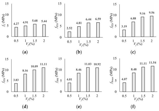 Effect of volumetric fiber ratio on flexural tensile strength: (a) fL; (b) fR1k; (c) fR2k; (d) fR3k; (e) fR4k; (f) fRmax.