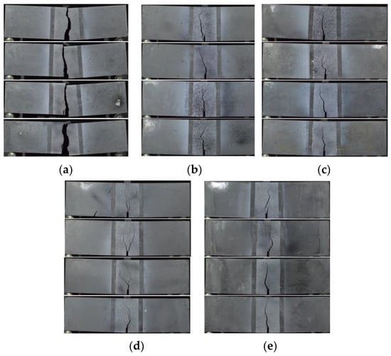 Cracking patterns of the beam specimens: (a) Vf = 0%; (b) Vf = 0.5%; (c) Vf = 1.0%; (d) Vf = 1.5%; (e) Vf = 2.0%.