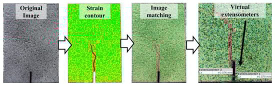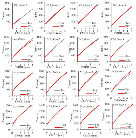 The cracking patterns observed at the end of the bending tests for each fiber volume ratio are illustrated in Figure 17. All beams exhibited identical cracking behavior, starting at the notch tip and progressing toward the loading point. For the non-fiber beams, failure occurred immediately after cracking in the notch area, causing the specimens to split into two pieces (Figure 17a). Unlike the beams without fibers, the opening and propagation of the cracks were limited due to the crack bridging ability of the macro-PP fibers and sudden failure could be prevented (Figure 17b–e). In this study, GOM Correlate [60] software was utilized to perform two-dimensional digital image correlation (2D-DIC) analysis. With the help of the software, virtual extensometers were placed under the notch, and CMOD values were determined (Figure 18). The measurement accuracy of the 2D-DIC was evaluated using time–CMOD curves consisting of experimental and analysis results (Figure 19). Figure 19 shows that the measurements obtained with 2D-DIC are quite compatible with the experimental results, which confirmed the measurement accuracy of 2D-DIC. The compatibility in the graphics shows that the 2D-DIC can successfully determine the deformations on the specimen surface.
