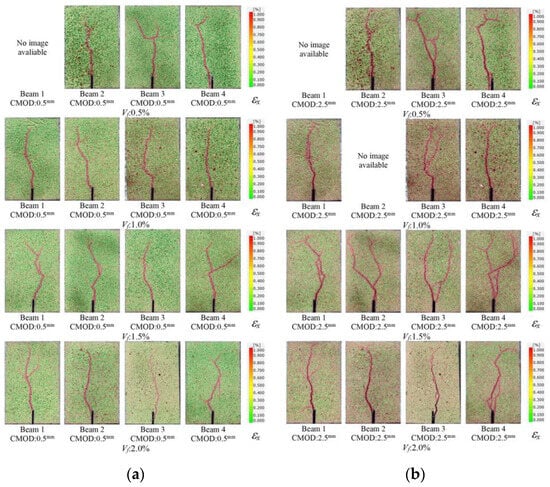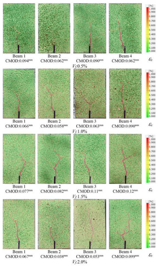 In order to visualize the crack formations, the strains in lateral direction (εx) were determined by using GOM Correlate software [60]. The lateral strain (εx) contour of the beam specimens with different fiber volume ratios at the cracking stage is presented in Figure 20. As can be seen from Figure 20, the onset of cracking was monitored accurately by 2D-DIC analysis. It was noted that, due to the abrupt nature of cracking, the closest image to the crack initiation can be presented in Figure 20. Although no visible cracks were observed by the naked eye at this stage, the early stages of cracking could be visualized using 2D-DIC.