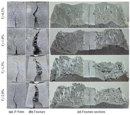 To investigate the role of macro-PP fibers on the fracture behavior of UHPC beams, representative specimens for each fiber ratio were selected and loaded to failure beyond the 5 mm deflection value at which the standard tests were terminated. The fracture sections of the specimens are presented in Figure 22. Figure 22b clearly shows the crack bridging ability of the macro-PP fibers in the fracture section. Despite the presence of excessive crack openings, the fibers prevented brittle failure through crack bridging followed by pull-out behavior. Significant deformation was observed in the fibers with some instances leading to rupture. The examination of the fracture sections in Figure 22c reveals a generally good fiber distribution. The deformations that occur in the fibers during debonding were also visible.