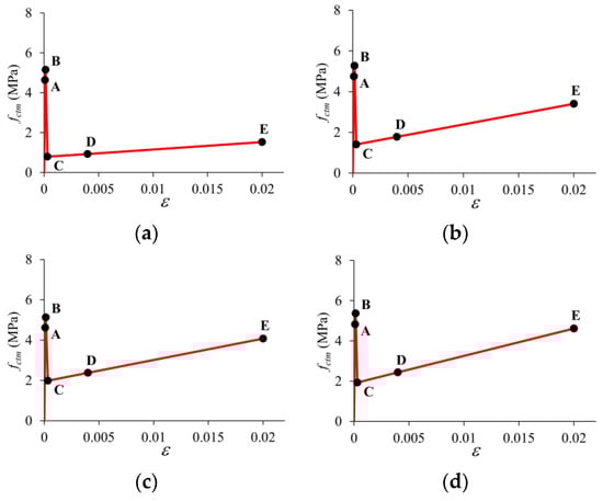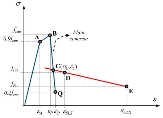 A bilinear relationship was applied to the post-cracking stage for Case I (Figure 23). The post-peak propagation branch BC is analytically described with Equations (7) and (8), where Gf is the fracture energy of the plain concrete is determined by Equation (9). The modulus of elasticity Ec is calculated by Equation (10) when the experimental compressive strength fcm is known. The αE is 1.0 for quartzite aggregate and Ec0 is 21.5 × 103 MPa in Equation (10). The strain values corresponding to SLS (εSLS) and ULS (εULS) are determined by Equations (11) and (12), respectively. In these equations, ultimate tensile strain εFu is equal to 0.02 for variable strain distribution along the cross-section, and the characteristic structural length lcs is taken equal to the beam cross-sectional height in accordance with MC2020 [60]. The branch DE is defined by two points corresponding to (εSLS, fFts) and (εULS, fFtu). fFtu represents the ultimate residual strength and is determined by Equation (13) where wu is the maximum crack opening taken as 2.5 mm. Point C is obtained geometrically by the intersection of branch BQ and DE (Figure 23). Table 4 shows the coordinates of the characteristic points on the stress–strain diagrams.