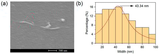 Results obtained from the SEM analysis of the BNC used in this work (UCO-Gly), showing the heterogeneity in width for both individual nanofibers (a) and the bulk sample (b). The average width value for the population was obtained after randomly analyzing 100 nanofibers using ImageJ and OriginPro software.