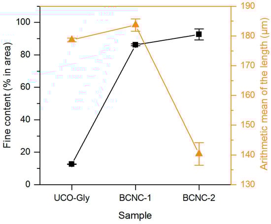 Morphological analysis via MorFi of pristine BNC (UCO-Gly) and nanocellulosic forms obtained after severe (BCNC-1) and mild (BCNC-2) acid hydrolysis. The figure shows the fine content (% in area) and the arithmetic mean of fiber length (μm) measured by the equipment for each sample, illustrating the impact of the applied treatments.