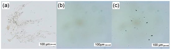 Optical microscopy images of UCO-Gly (a), BCNC-1 (b), and BCNC-2 (c) suspensions, obtained in bright-field mode with transmitted light. The figure layout was designed using GIMP (MacOS, ver. 2.10.38).