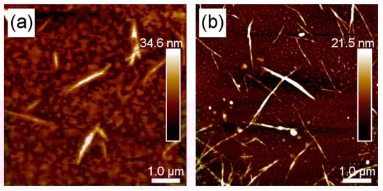 Atomic force microscopy images of BCNC-1 (a) and BCNC-2 (b) samples. The figure layout was designed using GIMP (MacOS, ver. 2.10.38).
