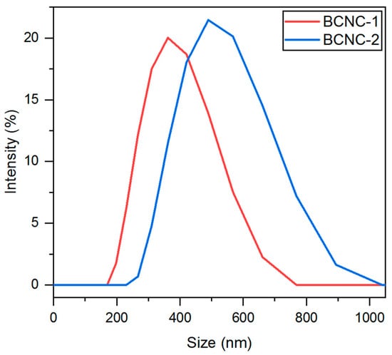 DLS is commonly employed to assess the main size distribution range of non-spherical nanoparticles, such as CNCs. However, as it measures the hydrodynamic radius, its value often deviates from measurements obtained through other observation techniques. Hence, DLS is more often used to establish relative differences between particles subjected to the same treatment [,,]. As shown in Figure 6, the values obtained for BCNC-1 ranged from 169 to 766 nm, whereas BCNC-2 exhibited higher dimensions, spanning from 230 to 1037 nm. These results align with previous research, associating more severe acid hydrolysis conditions (i.e., BCNC-1) with a reduction in the DLS size (also known as apparent size) of the obtained nanocrystals []. Additionally, these values are consistent with the results obtained in AFM characterization, which evidenced nanocrystals with increased length and width when milder acid hydrolysis conditions were applied (i.e., BCNC-2). Moreover, a single set of measurements was obtained in both cases, indicating that the acid hydrolysis led to the formation of uniform BCNCs populations.