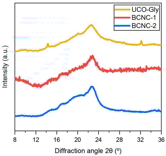 X-ray diffraction (XRD) patterns of UCO-Gly, BCNC-1, and BCNC-2, displaying the typical diffraction peaks associated with the allomorphic cellulose I structure. This arrangement was preserved across treatments, regardless of whether severe (BCNC-1) or mild (BCNC-2) acid hydrolysis was applied.