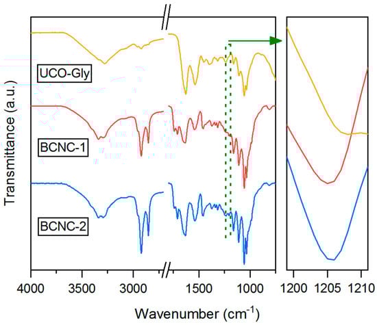 The FTIR spectra obtained for UCO-Gly, BCNC-1, and BCNC-2 (Figure 8) were highly similar, indicating an identical chemical composition among the three cellulose forms analyzed []. Indeed, all of them exhibited typical absorption peaks around 3000–3650 cm−1 (O–H stretching of intramolecular hydrogen bonds), 2920 cm−1 and 2853 cm−1 (–CH2 stretching), 1430 cm−1 (CH2 symmetric bending), 1371 cm−1 (symmetric angular deformation of C–H bonds), 1160 cm−1 (asymmetrical stretching of C–O–C glycoside bonds), 1110 cm−1 (stretching of C–OH and C–C–OH bonds in secondary alcohols), and 1059 cm−1 (stretching of C–OH and C–C–OH bonds in primary alcohols) [,,]. However, subtle changes were observed in some of the absorption peaks in both BCNC spectra. In fact, the region from 3650 to 3000 cm−1 appeared slightly modified in intensity and shape, suggesting a change in the H-bonding pattern due to the acid hydrolysis treatment. Additionally, a new absorption peak at 1740 cm−1 (bending vibration of –COOH) was observed, indicating further oxidation of the pyranose ring []. Similarly, a new peak around 1205 cm−1 was identified, indicative of the substitution of –OH groups by sulfate groups during the reaction []. In this regard, the characteristic absorption peak of the esterification of hydroxyl groups in cellulose chains (symmetric vibration of C–O–S bonds associated with C–O–SO3− groups) was also observed around 813 cm−1 []. Furthermore, it was observed that the absorption peak around 1430 cm−1, commonly referred to as the ‘crystallinity band’, exhibited greater intensity in both BCNCs samples compared to UCO-Gly. This aligns with the results obtained from XRD analysis, thereby confirming the effectiveness of the hydrolysis treatment in breaking down the amorphous regions of UCO-Gly [].