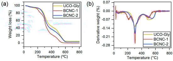 Thermogravimetric analysis (a) and derivative thermogravimetry (b) profiles obtained for UCO-Gly and the produced BCNC-1 and BCNC-2.
