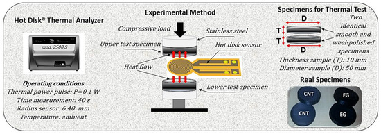 The epoxy resin blend and DDS (diamino-diphenyl sulfone) were mixed at 120 °C, followed by the addition of the carbon-based nanoparticles, which were integrated into the matrix using ultrasonic processing for 20 min. The resulting epoxy nanocomposites were prepared with two different nanoparticle loadings, specifically 0.5% and 1% by weight. To perform thermal analysis measurements, silicone molds with suitable geometry and dimensions were prepared to obtain cylindrical samples with a thickness of 10 mm and a diameter of 50 mm. After sonication, the fluid epoxy mixture loaded with EG was slowly poured into the silicone mold. Then, the samples were solidified through a curing process consisting of a two-stage isothermal cycle: an initial stage at 125 °C for 1 h and a second stage at 200 °C for 3 h.