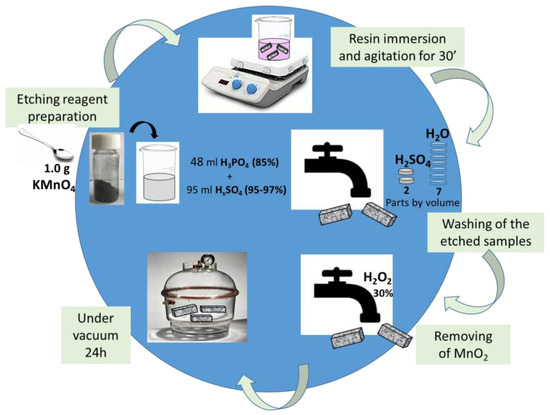 The morphological characteristics of the obtained nanocomposites were analyzed using a Field Emission Scanning Electron Microscope (FESEM) (JSM-6700F, JEOL- Akishima, Tokyo, Japan), operating at 3 kV. Thin sections of the nanocomposites were prepared by slicing solid samples with a sledge microtome, followed by an etching process before the FESEM observation, as schematically summarized in Figure 3. The etching solution was prepared by dissolving 1.0 g of potassium permanganate in a mixture of 95 mL sulfuric acid (95–97%) and 48 mL orthophosphoric acid (85%) under continuous stirring. The resin-filled samples were submerged in this freshly prepared reagent at room temperature, with agitation maintained for 36 h. To remove residual reagents, the samples underwent a multi-step washing process: first, they were rinsed with a cold solution composed of 2 parts concentrated sulfuric acid and 7 parts water. This was followed by treatment with a 30% hydrogen peroxide aqueous solution to eliminate any remaining manganese dioxide. Finally, the samples were washed thoroughly with distilled water and left under a vacuum for 5 days to ensure complete drying. The etching procedure adopted in this work has proved very effective in analyzing the correlation between the nanofiller properties and related composites [34].