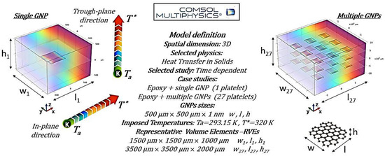 A method for selecting the representative volume element (RVE) in COMSOL simulations was specifically developed to isolate and analyze the thermal transport arising solely from the dispersed filler. Once the geometry of the graphene nanoplatelet was defined, both in the case of a single particle and a system of 27 particles, the chosen RVE size preserved equivalent alternative thermal pathways for both the filler and the matrix in the x and z directions. Importantly, the consistency of the results between the simplified and more complex configurations demonstrates that the approach is valid and not inherently dependent on particle numbers. Consequently, it can be extended to model any filler concentration, with the only limiting factor being computational cost.