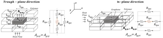 In this model, the resistance components are associated with graphene platelets and the polymer matrix, considering their distinct thermal conductivities and geometric characteristics. The term Ligj represents the characteristic length of the graphene domain in direction j, while Lipj corresponds to the polymer subdomain. The thermal conductivity values λgj and λp describe the heat transport properties of graphene and polymer, respectively. It is important to note that graphene exhibits anisotropic thermal conductivity, meaning that λgx ≠ λgz, while the polymer is assumed to have isotropic conductivity λp.