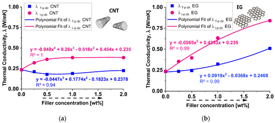 Figure 6 compares the experimental results on the thermal conductivity (λ) of composites of tetrafunctional epoxy resin, modified with low weight percentages (up to 2% wt) of fillers: carbon nanotubes (CNTs) are represented on panel (a) and exfoliated graphite (EG) is shown on panel (b). The thermal conductivity is analyzed in two directions: the through-plane (λT−p dir., represented by blue squares) and in-plane (λI-p dir., represented by pink circles) directions. The data clearly indicate that, in accordance with the current literature [35,36], epoxy composites incorporating 2D-exfoliated graphite nanoparticles exhibit superior heat transport properties compared to those loaded with one-dimensional carbon nanotubes (CNTs). This observation underscores the improved thermal conductivity of epoxy composites enhanced by exfoliated graphite, highlighting the distinct influence of nanoparticle morphology on heat conduction.
