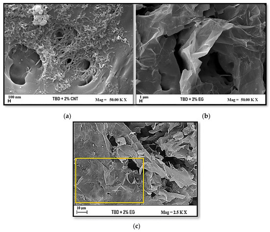 The FE-SEM images in Figure 7 provide an essential insight into the morphology of nanocomposites containing 2% nanofillers: multiwalled carbon nanotubes (MWCNTs) are shown in panel (a) and exfoliated graphite (EG) are shown in panel (b), respectively. From the analysis of these figures, it is possible to observe folded graphene sheets resembling the draping of a textile with the parallel preferential orientation of graphene layers/blocks. In both cases, the dispersion of the nanofillers appears to be sufficiently achieved, which is crucial for optimizing the electrical, mechanical, and thermal properties of the composite. A conductive network that is well-structured guarantees appreciable benefits on the properties mentioned above, as already discussed and reported in our previous studies [38,39]. It was worth noting that, apart from the natural tendency of the graphitic layers to dispose of themselves in a parallel way, due to the π-π attractive interactions, the procedure for the sample preparations determined the preferential orientation of the graphitic layers. In fact, because of their large surface area and their interaction with the polymeric matrix, they tend to align with the graphene layer of the graphitic block in a direction parallel to the silicone mold base. This trend is particularly evident in Figure 7c, where it stands out more distinctly (see the yellow frame).