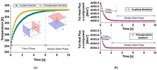 Temperature evolution over time for both investigated directions (in-plane and trough-plane) in panel (a) and the corresponding evolution of the total heat flux components along the in-plane (x-direction) and through-plane (z-direction) directions over time in panel (b).