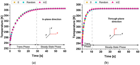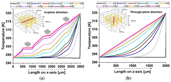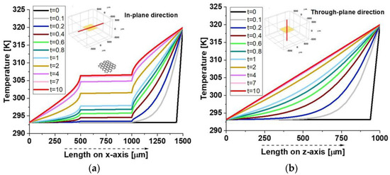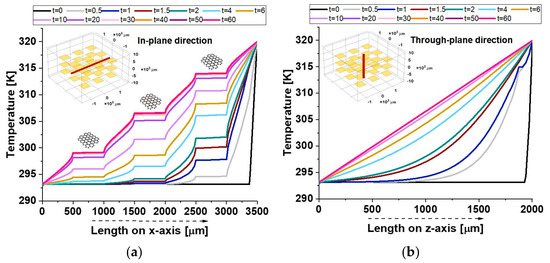 The two graphs in Figure 9 illustrate the temperature evolution along the symmetrical axes in both the in-plane direction in panel (a) and the through-plane direction in panel (b) of the composite material over time.