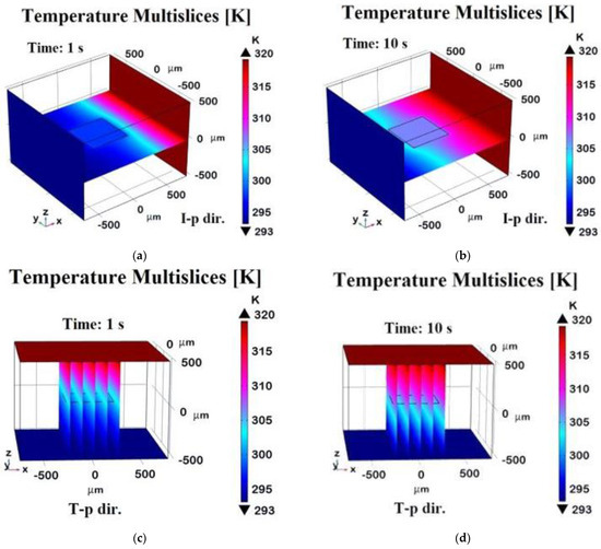 Figure 10 presents a 3D visualization of temperature distribution at t = 1 s and t = 10 s for in-plane (x-direction) and through-plane (z-direction) heat transfer. In detail, such temperature profiles are evaluated on a plane pass for the symmetric axis of the zy-plane distribution in the case of in-plane (I-p dir.) analysis or evaluated along transversal planes with respect to the xy-plane of graphene in the case of through-plane (T-p dir.) investigations. At t = 1 s in the x-direction (Figure 10a), a strong temperature gradient separates hotter and cooler regions, indicating incomplete heat diffusion. By t = 10 s (Figure 10b), the system reaches a near-steady state with a uniform thermal profile due to graphene’s high in-plane conductivity. Conversely, in the z-direction, temperature gradients remain more pronounced at t = 1 s (Figure 10c) and persist at t = 10 s (Figure 10d), though the gradient is somewhat smooth. This highlights graphene’s anisotropic thermal properties, with much lower conductivity in the through-plane direction.