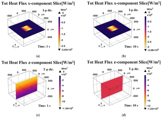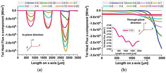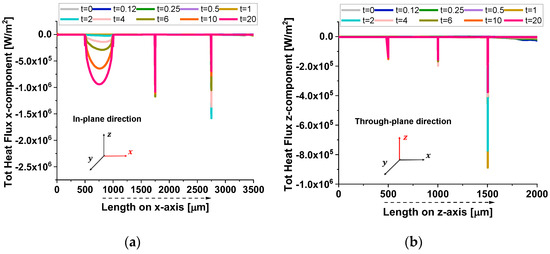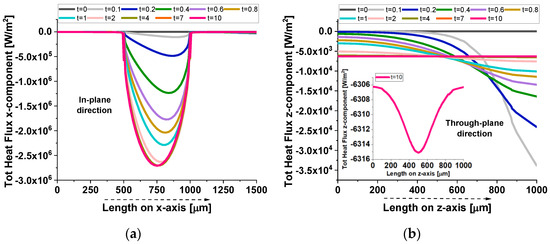 Figure 11 presents the total heat flux, specifically the x-component for the in-plane direction (a) and the z-component for the through-plane direction (b), evaluated at different time points. In the in-plane direction (panel a), the graphene platelet spans the region from 500 µm to 1000 µm along the x-axis, occupying almost half of the observed length. The curves at different times (up to t = 10 s) reveal that the heat flux increases sharply within this interval, reflecting the high thermal conductivity of graphene compared to the surrounding resin. Over time, the flux profile evolves as heat penetrates the material, but the graphene region consistently exhibits a higher flux, indicating more efficient lateral heat transfer. In the through-plane direction (panel b), the platelet extends by only 1 nm, creating a much thinner conductive layer. The flux, therefore, rises in this narrow band, though less dramatically than in the in-plane case since the path for conduction is limited by the platelet’s small thickness. The inset in the right figure provides a magnified view of this zone, highlighting the local increase in flux as heat crosses the graphene layer. Despite the short distance, the platelet still enhances through-plane conduction relative to the surrounding resin, yet its impact is not as pronounced as it is along the in-plane axis.