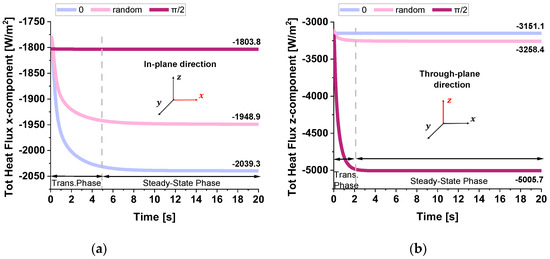 The preliminary results presented in this subsection highlight the influence of a single graphene nanoplatelet (GNP) embedded in a resin matrix. The orientation of the GNP is set to 0 radians, meaning that it lies parallel to the x-y plane. Figure 8a presents the evolution of the temperature with time. The temperature decreases in both directions, but it is slower in the in-plane direction (x-direction) than in the through-plane direction (z-direction). Figure 8b illustrates the evolution of the total heat flux components with time along the in-plane (x-direction) and through-plane (z-direction) directions. Initially, during the transient phase, both flux components decayed sharply in accordance with the temperature decrease in the same directions, and then each component was shown to asymptote to a different constant value once the equilibrium conditions were reached. Specifically, the flux in the z-direction decayed faster than the x-direction and reached a steady-state value (Qz = −6304.2 W/m2) after about 2 s, which is higher than the one reached along the x-direction after about 3 s (Qx = −4451.6 W/m2) because the temperature gradient along z was much higher than the gradient in the x-direction, even though the thermal conductivity in the plane was higher than that across the plane.