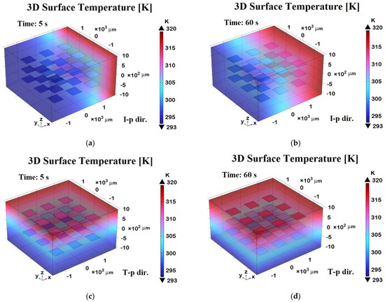 Three-dimensional surface temperature distributions in the case of randomly oriented GNPs in the in-plane direction (I-p dir.) at t = 5 s (transient phase, panel (a)) and t = 60 s (steady state, panel (b)). Panels (c) and (d) display the corresponding temperature profiles in the through-plane direction (T-p dir.) at t = 5 s and t = 60 s, respectively.