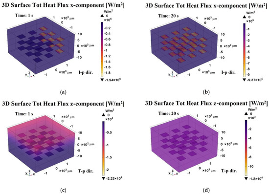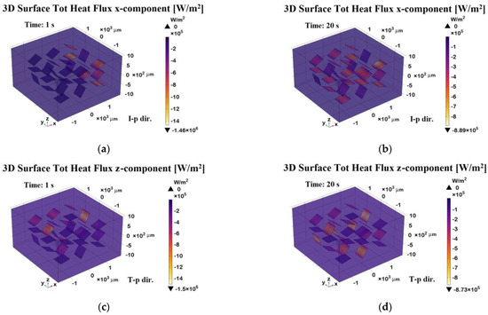 Three-dimensional surface distributions of the total heat flux in the case of randomly oriented GNPs within the resin. Panels (a,b) display the x-component along the in-plane direction (I-p dir.) at t = 1 s (transient phase) and t = 20 s (steady state), respectively. Panels (c,d) show the z-component of the total heat flux along the through-plane direction (T-p dir.) at the same time points.