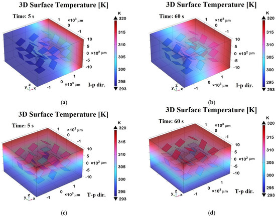 Compared to the aligned configuration, the temperature distribution here appears less uniform and more scattered, indicating reduced thermal conductivity in the in-plane direction. The heat spreads in a less directional and more diffused manner, underscoring the loss of thermal guidance provided by aligned platelets. Figure 22c,d display the corresponding temperature distributions in the through-plane direction (T-p dir.) at the same time points. A similar trend was observed, with less efficient heat transfer and more pronounced thermal gradients. The propagation of heat was visibly hindered, and the surface remained cooler relative to the aligned case, especially at early times. Overall, this figure clearly demonstrates that the random orientation of the GNPs weakens the material’s thermal anisotropy, leading to less effective and less directed heat transfer in both the in-plane and through-plane directions. The 3D visualizations are particularly effective in emphasizing these effects, making their contrast with the aligned configuration immediately apparent.