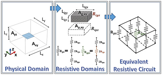 The integration of thermal circuit theory was intentionally introduced to provide a complementary and mutually reinforcing interpretation of the thermal behavior of the nanocomposites. The thermal circuit model provides a simplified analytical perspective on anisotropic heat transfer, while COMSOL simulations deliver a detailed, three-dimensional analysis that captures the spatial effects of thermal property distributions. The added value of combining both approaches lies in their complementarity; while the thermal circuit model validates the physical consistency and theoretical grounding of the simulations, the simulations extend and contextualize the analytical results to more complex and realistic systems. Together, they build an interesting framework that not only explains the experimental observations but also supports the predictive capabilities of the model. Regardless of the number of graphene nanoplatelets and the observation direction, the methodology adopted for analyzing the thermal properties remains consistent. As illustrated in the simplest case of a single graphene sheet observed along the z-direction (Figure 25), the approach involves decomposing the physical domain into multiple resistive subdomains.