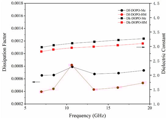 The Df values of two flame retardants are plotted against the frequency in Figure 2. Clearly, except at a resonant frequency around 11 GHz, DOPO-HM has much lower dielectric losses than DOPO-Me in the measured range. This is rather interesting because the hydroxyl group in DOPO-HM actually produces the sought-after effect of lowering the Df values. Perceptibly, it is attributed to hydrogen bonds formed between P=O and OH, which slow down a dipole reorientation of the polar groups in DOPO-HM under a fast alternating electric field [22]. As a result, the dielectric loss of DOPO-HM is decreased. This effect is similar to that of hydroxyl group on the dielectric loss of epoxy or hydroxylated polypropylene, where hydrogen bonds contribute to a reduction in the dielectric loss, although hydrogen bonds are produced by an extraneous additive in the latter cases [23,24].