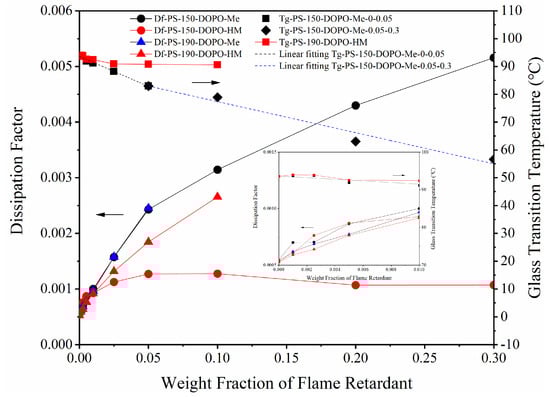Compared with PS-150-DOPO-Me, PS-150-DOPO-HM has notably lower Df values at high loadings of the flame retardant. Even when cooled from a higher processing temperature which enables complete melting of DOPO-HM, PS-190-DOPO-HM still produces lower Df values at 20 GHz than PS-190-DOPO-Me, which has almost identical Df values as PS-150-DOPO-Me. Obviously, poorer plasticization of amorphous DOPO-HM, as evidenced by less reduced Tg values shown in Figure 3, could not enhance mobility of PS chains as great as amorphous DOPO-Me does. In other words, DOPO-HM is more associated at high loadings and hence the Df increases slow down. From the above results, it can be seen that organophosphorus flame retardants with a hydroxyl group can actually be advantageous in non-polar polymers in keeping a low dielectric loss of the latter.