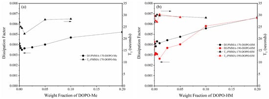 Df and T1 relaxation time constant of carbonyl carbon of PMMA/FR (Df values are taken at 20 GHz): (a) PMMA-DOPO-Me; (b) PMMA-DOPO-HM.